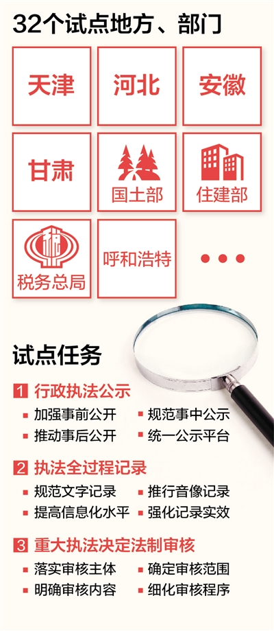 《试点方案》要求,开展试点工作要按照依法有序、科学规范、便捷高效的原则,紧密联系实际,突出问题导向,积极稳妥实施,总结可复制可推广的经验做法。一是执法公示制度重在打造阳光政府。各试点单位要及时主动公开执法信息,让行政执法在阳光下运行,自觉接受群众监督。国务院有关部门要积极推动本系统的执法信息公示平台与地方统一平台的互联互通。二是执法全过程记录制度重在规范执法程序。各试点单位要逐步扩大执法音像记录的适用范围,对涉及人身自由、生命健康、重大财产权益的执法活动,实现全过程记录。要加强执法数据的统计分析,充分发挥执法大数据在政府决策、行政管理、优化服务、监督权力等方面的作用。三是执法决定法制审核制度重在保证合法行政。各试点单位要确保每项重大执法决定必须经过合法性审查,守住法律底线。要加强法制审核能力建设,切实保证行政执法决定严格依法作出。