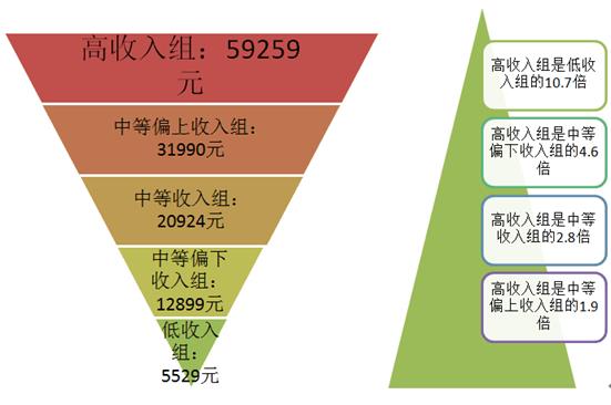 根据国家统计局2017年1月20日公布的《2016年国民经济实现“十三五”良好开局》报告中,关于居民收入稳定增长,城乡差距继续缩小一段中的数据,按照全国居民五等份分组,居民可支配收入差距情况如下图所示: