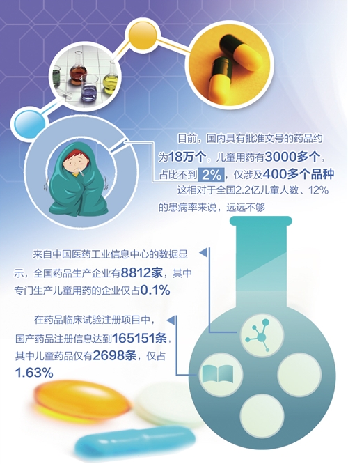 来自中国医药工业信息中心的数据显示,全国药品生产企业有8812家,其中专门生产儿童用药的企业仅占0.1%。在药品临床试验注册项目中,国产药品注册信息达到165151条,其中儿童药品仅有2698条,仅占1.63%。临床试验登记的儿童药品仅占2.35%,相对于美国等发达国家超过20%的占比来说,显得过少。