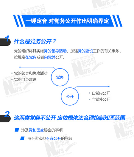 长期以来,关于什么是党务公开,理论上和实践中有一些不同观点。《条例》对此作了明确界定,即党务公开是指党的组织将其实施党的领导活动、加强党的建设工作的有关事务,按规定在党内或者向党外公开。而且《条例》还规定了除涉及党和国家秘密不得公开、依照有关规定不宜公开的事项外,一般应当公开。