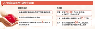对照更高标准抓重点、补短板、强弱项,加强资金项目监管、统筹服务保障,进一步加强农村低保制度与扶贫开发政策有效衔接……新的一年,各地陆续开出“弱有所扶”民生清单:吉林全面实施幸福养老、幸福帮扶、幸福社区建设、幸福便民、幸福公益“五大民政幸福工程”;四川确保实现100万贫困人口脱贫、3500个贫困村退出;宁夏民政部门对城乡低保对象、低收入家庭未成年人、家庭经济困难在校大学生医保个人缴费部分每人每年补助70元。
