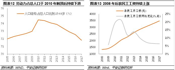 人口红利II是农民工进城压低了城市的工资水平。而现在农民工的劳动力市场关系发生了重大变化,过去严重供过于求不复存在,现状转变为供不应求,已经爆发多次民工荒。最典型的现象是:农民工的工资剔除通胀后,在1978年-2003年基本上没有变化,反映出劳动力供过于求;而在2004年之后,尤其是2007年至今,农民工工资剔除通胀后平均每年上涨15%。这种快速的上涨,有利于农民工自身的福利水平提升,但却加大了实体企业,尤其是劳动密集型企业的经营压力,使其面临税负高、融资成本高、劳动力成本高的局面。随着工资开始上涨,价格方面的红利也开始弱化。综上,劳动力数量在下降,价格在上升。