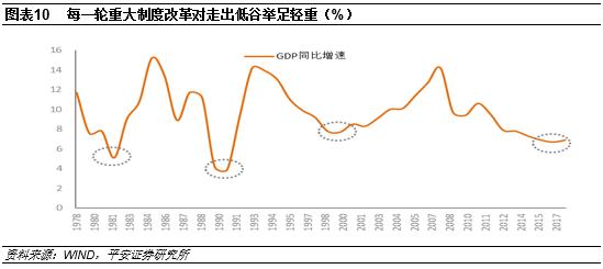 制度因素是指重大的制度变革。尽管改革开放前30年中国年均GDP增速高达10%,但是波动较大,如1990年GDP增速只有4%,1994年GDP增速快速升至14%。在改革开放前30年中,中国GDP增速有三次低谷,第一次是80年代初期,第二次是1989-1990年,第三次是1998-1999年;而GDP增速每到低谷时,中国就会发生一次重大的制度变革,重塑经济增长动力。前30年中国大约十年进行一次重大变革:80年代初的关键词是承包,包括农村联产承包制和城市的企业承包制改革;90年代初的关键词是市场化,1992年小平南巡和1994年十四届三中全会确定中国走市场化经济道路。90年代末到2000年初,国企改革、1998年住房商品化和2001年中国加入WTO,其中房地产成为过去十五年中国经济增长最主要的引擎。