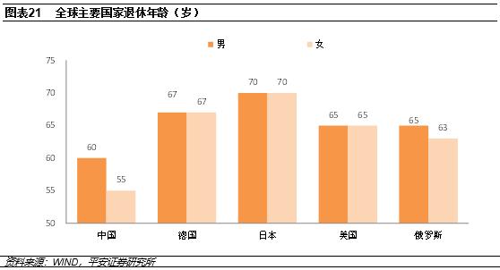 针对人口红利I的下降,劳动力人口/总人口的下降无法避免,但可以采取如下措施延缓下降速度。第一,调整计划生育政策。目前计划生育政策已有所调整,二胎逐渐放开,但家庭是否生育存在不确定性。如果家庭均生育二胎,虽然短期内劳动力人口/总人口指标会加速下降,在中长期将对经济增长有利。值得一提的是,虽然家庭单独二胎政策已经放开很久,但人口增量上并未见明显反弹。第二,延迟退休。延迟退休可以延长劳动时间,减少退出劳动力人群的数量,从而减缓人口红利I 的消退。此外,延迟退休还可以延长居民缴纳社保的时间,减轻社保压力。目前,发达国家最高退休年龄是日本的70岁,中国人均寿命也已有明显延长,理论上还有较大的上调空间。第三,从国外引进年轻人口。从已有经验看,在发达国家如美国、欧洲等大多是靠移民来应对人口老龄化问题;而日本是全球移民限制最严厉的国家,同时也是人口老龄化最严重的国家。
