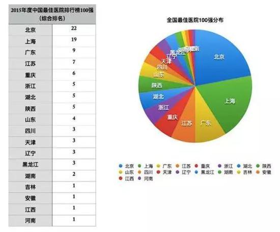 与教育资源的空间分布类似,我国的医疗资源分布也呈现出一定的地域差异。以三甲医院为例,北京协和医院、四川大学华西医院、中国人民解放军总医院,这三家医院已连续多年分别蝉联冠、亚、季军。此外,全国最好的医疗资源主要集中的北京、上海、广州这三座城市,排行榜100家医院中,这三个城市占了一半,而另外的一半则被其它省市瓜分。