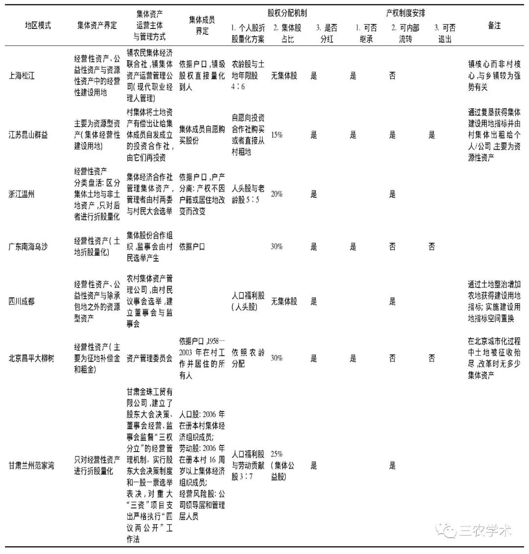 在成员界定方面, 一般依据某特定时期的户口, 但也兼顾当地情况并依据相关政策而定。在表1中所列的7种典型模式中, 除昆山模式外, 成员界定都依据当地户口而定, 这也是最为简便与合理的方式。除此以外, 对于长期生活在当地的外地人和长期居住在外地的当地人, 不同地区也有相应的安排。温州地区坚持“户产分离”, 也就是农村集体产权不因户籍或居住地的改变而改变;而北京昌平则在户口的基础上, 将1958年至2003年在村工作并居住的所有人囊括其中。