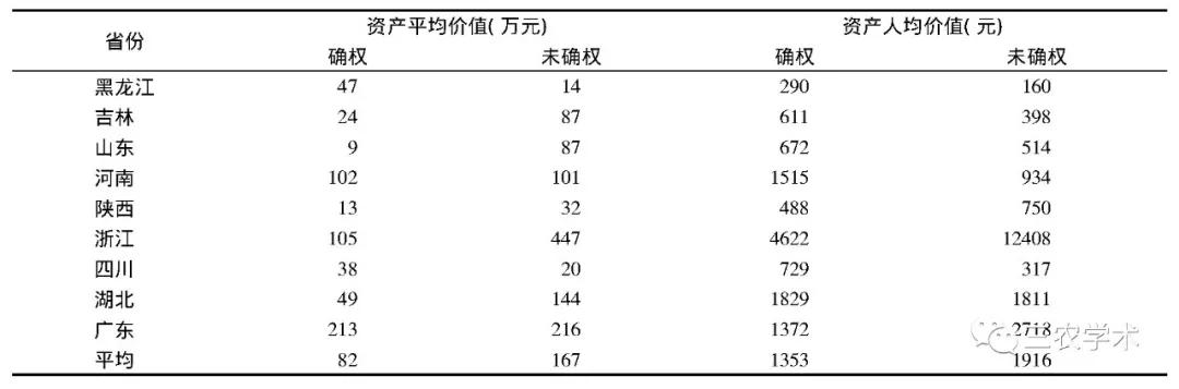 尽管总样本平均水平上已确权的资产平均价值显著低于未确权资产平均价值, 但各省确权与未确权资产平均价值之间存在明显的非一致性差异。如表4所示, 2017年初, 总样本未确权的资产平均价值为167万元, 比已确权资产的平均价值 (82万元) 高一倍;从资产的人均价值看, 未确权资产人均价值1916元也高于已确权资产人均价值 (1352元) 。但从各省数据看, 未确权资产价值高于确权资产价值的现象并不是一致的, 只有一半左右的省存在以上现象 (例如吉林、山东和陕西) , 而在一些省份 (例如黑龙江、四川和河南) , 资产确权与其价值则呈现相反的关系。