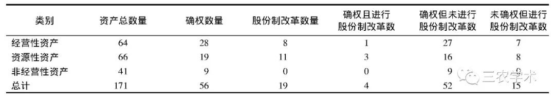 此外, 已开展股份制改革的资产中, 大部分都没有完成确权工作。如表3所示, 2017年初, 19个进行股份制改革的资产中仅4个完成了确权工作。经营性与资源性资产在不确权的条件下就执行村集体资产的股份制改革, 可能会造成村集体资产的流失, 表明村集体资产的改革工作程序还需规范管理。