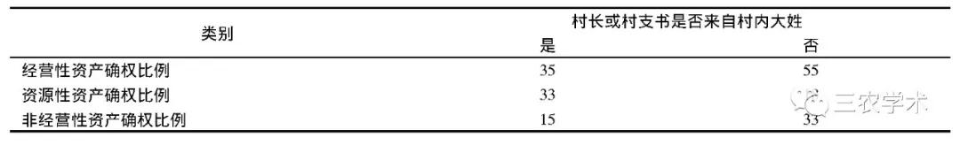 农村集体资产确权进度与基层政治社会环境存在一定相关性。村长或村支书来自村里大族的村子一般沿袭了较为传统的集权式村治, 导致村经营性与非经营性资产确权数量比例相对较低, 而资源性资产确权比例较高。如表6所示, 对于村长或村支书来自村内大姓的村样本, 平均35%的经营性资产和15%的非经营性资产完成了确权;而对于村长或村支书来自非大姓的村样本, 平均55%的经营性资产和33%的非经营性资产完成了确权。相反, 如果村长或村支书来自村内大姓, 那么村集体资产中资源性资产确权比例较高, 达到33%。由此可见, 传统的集权式村治有利于农村集体资源性资产确权, 但却阻碍了经营性与非经营性资产的确权。