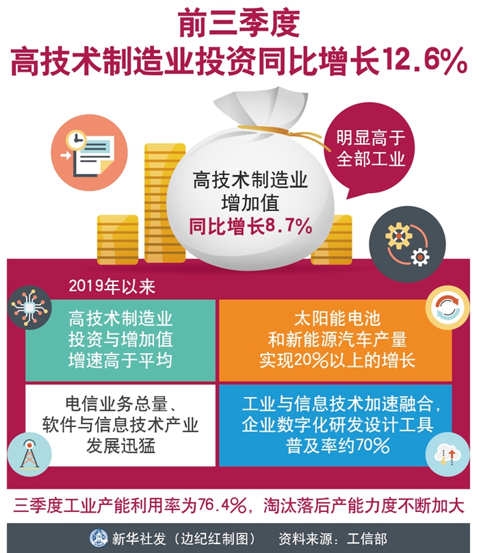 投资的增加也彰显了创新的活跃。前三季度,高技术制造业投资同比增长12.6%,明显快于制造业2.5%的投资增速。
