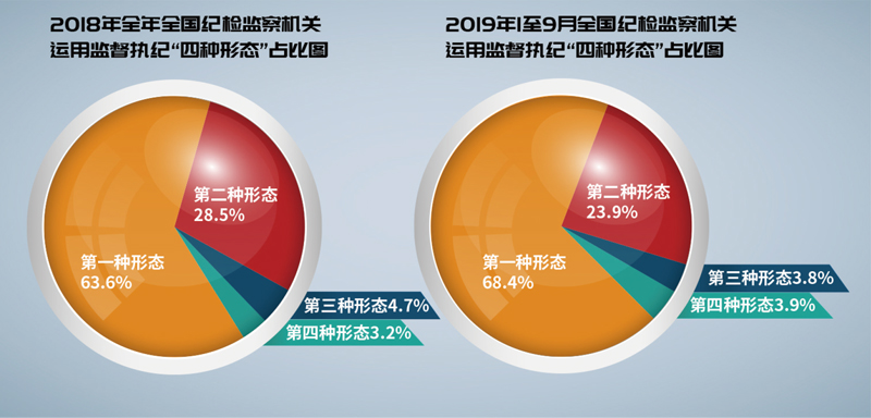 “四种形态”贯通规、纪、法,兼具教育警醒、惩戒挽救和惩治震慑功能,是一体推进不敢腐、不能腐、不想腐的重要载体,是一个环环相扣、严密完整的逻辑体系。2019年1至9月,运用第一、二种形态人次数量所占比例为92.3%,运用第三、四种形态人次数量所占比例为7.7%;运用第一种形态人次数量所占比例从2018年的63.6%,提高到2019年前三个季度的68.4%,“红脸出汗”已渐成常态,实现了惩治极少数、教育大多数的政治和社会效果。 张晴/制图