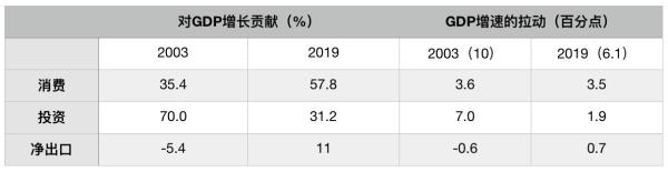 此外,拉动中国经济增长的“三架马车”——消费、投资、进出口也发生了很大的变化。2003年,消费贡献了35.4%的经济增长,当时的经济增长速度是10%,其中消费供给了3.6个百分点。但是到2019年,消费已经贡献了57.8%的经济增长。