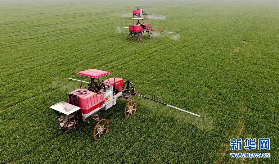 3月9日,河北省南和县郝桥镇后西村农民操作农业机械在麦田喷洒农药(无人机照片)。 新华社记者 朱旭东 摄
