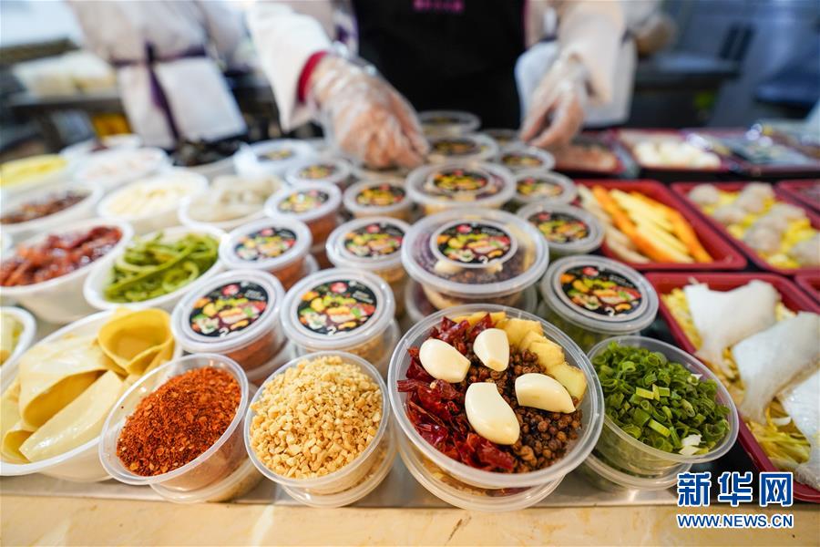 在重庆小天鹅火锅标准化生鲜火锅外卖的门店内,后厨的工作人员在清点生鲜火锅外卖订单的火锅配料(3月13日摄)。 新华社记者 刘潺 摄