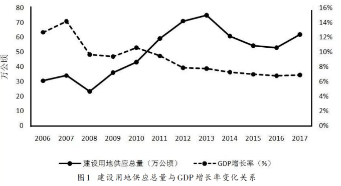在过去40年间,中国不仅依赖土地的宽供应作为发动机的功能,拉动着经济高速增长,而且利用土地供应开关调控经济节奏,经济过热时收紧土地供应,经济过冷时放开土地供应。但是,一个显然的事实是,土地发动机的功能在2010以后开始效力减退。如图1所示,2010年开始,中国经济增长开始减速,应对的策略之一也采取了放宽土地的供应,2008~2013年期间,年均建设用地供应量达到51.4万公顷。尽管如此,中国GDP增速没有回到曾经的高增长,还是一路下滑,GDP 增长率年均下降0.93%;建设用地供应也出现历史性峰值,到2014时,建设用地供应量比上一年减少9.08万公顷,之后的情形是,经济增长阶段转换和转型加快,经济增长维持在2013~2017年的年均7.1%的中高速水平,全国的土地供应量却在2013年后逐年下减少。这预示着,随着经济发展阶段转换,依靠土地宽供应拉动经济增长的模式已发生历史性转换。这一阶段土地对经济增长的影响表现为:放地拉增长→经济增速先增加后下降→继续放地拉增长→经济增速继续下行→土地需求量也随之下降,土地发动机功能不再。