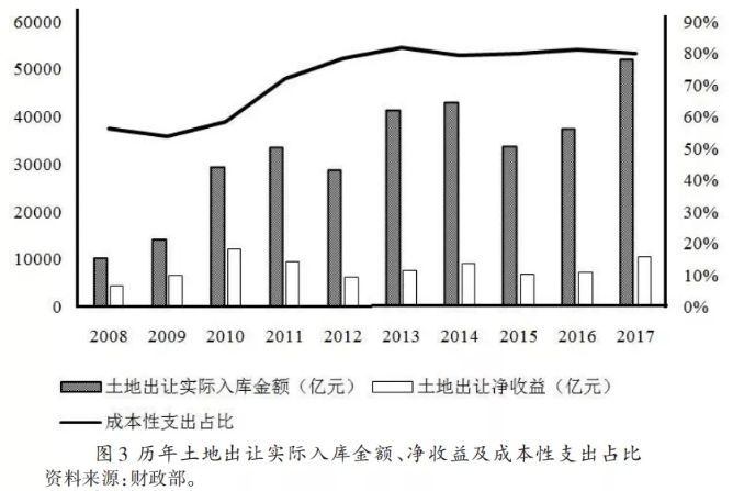 首先,地方政府对土地出让收入产生严重依赖。2015年全国土地出让收入实际入库金额为6.51 万亿元,相比2008年增长了11.9倍,但扣除成本性支出后的土地出让净收益却仅增长了2.68倍,这一方面是因为土地出让成本上升,随着近年来很多城市的用地从原来的新增用地转向存量用地,加上农民权利意识觉醒,征地拆迁的成本大幅上升。2008年以来,政府土地出让成本大幅上升,很多地方征地成本占到土地出让收入的一半以上,2017年更是达到了80%。另一方面是因为国家对房地产市场的管控趋紧,使得地方政府通过土地出让获得的收益降低。成本上升导致政府的土地净收益下降,虽然中国土地出让实际入库金额一直在逐年攀升,但近几年全国扣掉成本的土地出让净收益仅剩20%左右(图3)。中国已告别低价征地的低成本城市化时代。