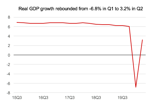 一季度,受疫情影响,中国GDP收缩了6.8%。但在二季度回到了3.2%的正增长。之前有讨论是否会看到一个V型、U型或是L型的复苏。