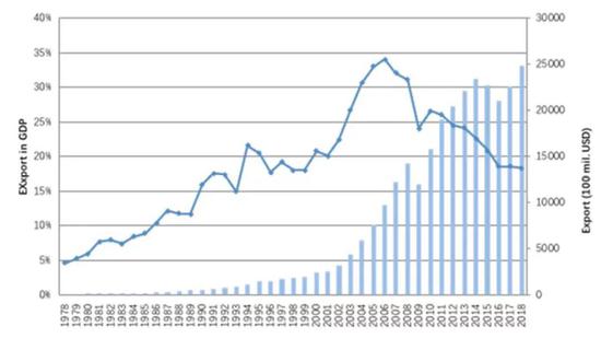 年出口额及出口/GDP比例波动曲线(来源:国家统计局)