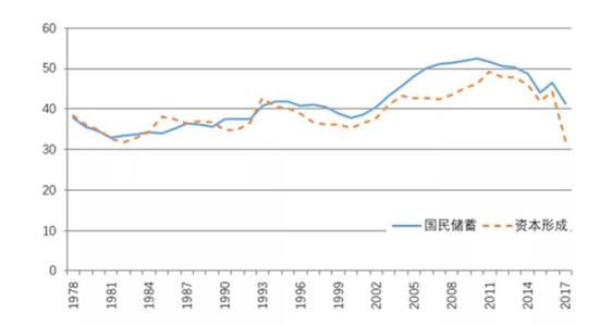国民储蓄、资本形成占GDP的比例(%)(来源:国家统计局)