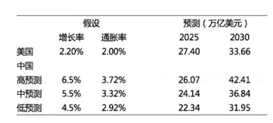 假设美国的增长率为2.2%,通胀率2.0%,而中国按高、中、低三种情况预测增长率分别会达到6.5%、5.5%和4.5%。中国以美元计算的通胀率,包括了升值的成分,5年以内中国即使保持6.5%的高增长率也赶不上美国。但是10年之后,以预测的中速度就能超过美国,即使按预测的低增长率,也跟美国比较接近。