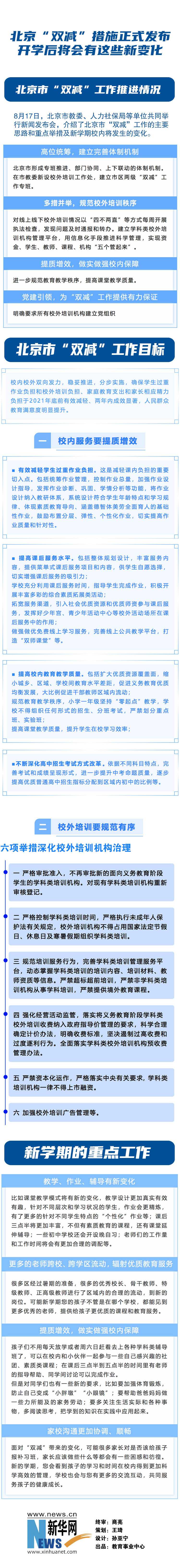 8月17日,北京市教委、人力社保局等单位共同举行《关于进一步减轻义务教育阶段学生作业负担和校外培训负担的意见》新闻发布会。介绍“双减”措施和新学期工作重点等情况。