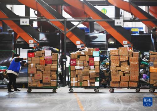 在中国邮政集团有限公司河南省郑州邮区中心,工作人员在转移快递包裹(11月11日摄)。新华社记者 张浩然 摄