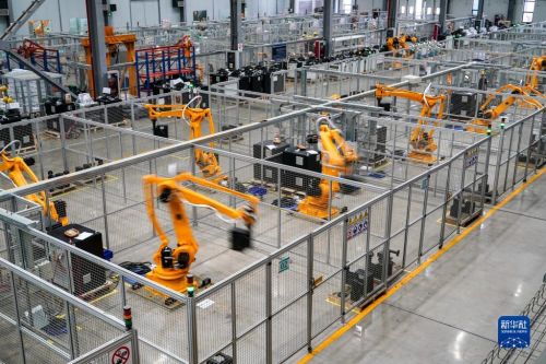 7月1日,在位于江苏省南京市江宁区的南京埃斯顿自动化股份有限公司工业机器人生产车间,工业机器人在进行跑合测试。新华社记者 李博 摄