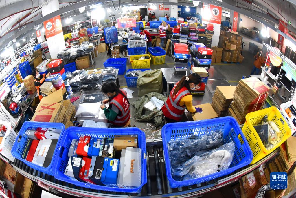 工人在江苏省连云港市海州区天马电商产业园按照订单分拣货品(2022年11月11日摄)。新华社发(耿玉和 摄)