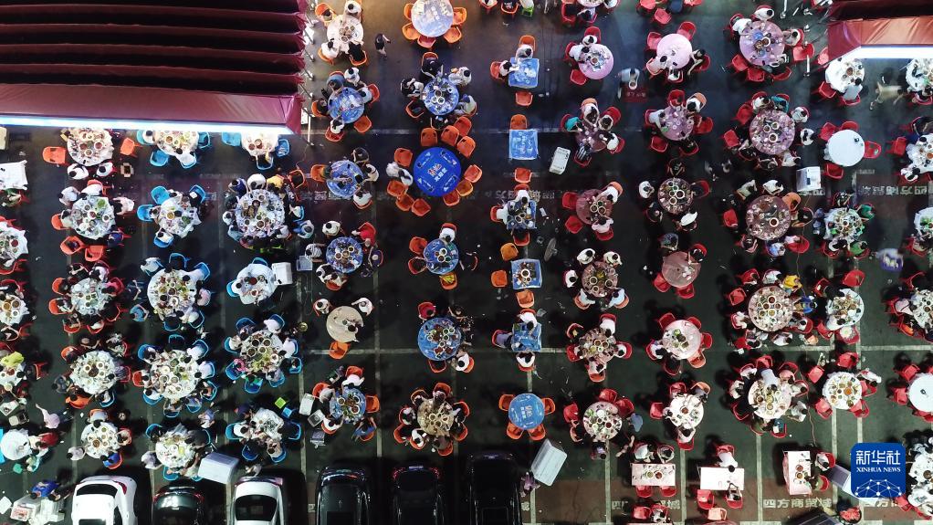 游客在湖南长沙四方坪夜市就餐(2022年7月29日摄,无人机照片)。新华社记者 陈振海 摄