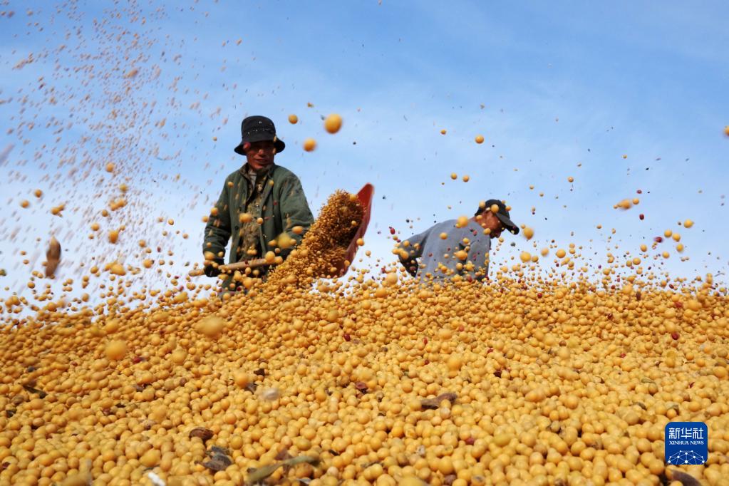 在北大荒农垦集团有限公司北安分公司赵光农场有限公司,工作人员在一处晒场的大豆堆上忙碌(2022年10月20日摄)。新华社记者 王建威 摄