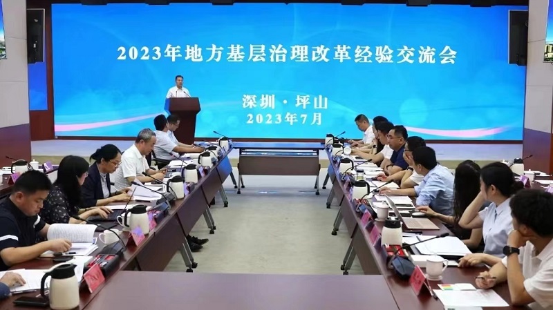 7月5日,围绕地方基层治理改革经验和坪山区基层社会治理实践,调研组与坪山区有关部门举行了交流座谈会。会议由我社副社长、地方改革创新研究院副院长蔡文武主持。坪山区委常委、区委(区政府)办公室主任冷和明出席交流会并致辞。坪山区委常委、组织部部长王伟燕出席会议并就坪山区推进党建引领城市居民小区协同共治作了经验交流。深圳市委改革办秘书处处长邓敏玲以“推进民生诉求综合服务改革,探索超大城市党建引领基层治理新路”为题,介绍了深圳基层治理改革经验。中央财经大学耿云教授表示,坪山区深入推进党建引领基层治理改革,打造“党群服务中心+民生诉求系统”的名片,为更多地区基层社会治理、社区治理提供了很好的借鉴参考。山东省淄博市委改革办专职副主任、二级调研员李卫介绍了淄博市“以城市合作人推进社会治理共同体建设的实践与思考”经验。浙江省绍兴市委改革办副主任蒋雪强介绍了新时代“枫桥经验”绍兴实践。河北省邢台市委改革办副主任左瑞河、湖南省衡阳市委改革办副主任郑欢、安徽省亳州市委政策研究室(改革办)副主任卢健、亳州市谯城区数据资源管理局副局长郁晓晴等交流了相关经验。坪山区委政研室主任吴正红,坪山区创新智库研究中心主任袁训国,坪山区相关部门、单位和街道负责人参加了座谈交流。