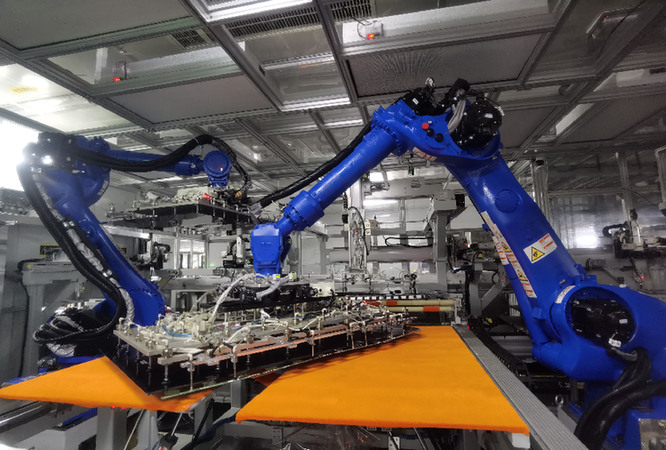 在海信视像智能车间的生产线上,机器人对液晶面板和背光板自动化精准卡合。记者 王凯 摄