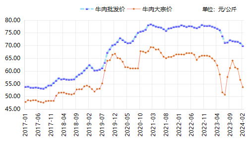 对于我国肉牛产业来讲,2023年是个分水岭。2023年之前,由于我国牛肉需求旺盛且供给提升缓慢,养殖成本居高不下,国内牛肉市场价格持续高位运行。进入2023年,这种上涨势头戛然而止,开始掉头下行。据农业农村部数据,截至2023年7月14日,全国牛肉大宗价和平均批发价分别为50元/公斤和71.28元/公斤,较2023年初分别下降24.2%和8.3%。与之相比,2021年、2022年,全国牛肉大宗价和平均批发价基本稳定在66元/公斤和77元/公斤左右。为了提振国内牛肉市场,2023年7月27日,国家开展年内首次冻牛羊肉收储1800吨,10月10日。国家再次启动牛羊肉收储5400吨,同期国内猪肉价格上涨,7月末开始国内牛肉价格相继上涨,10月份之后又转而下跌至今。根据农业农村部数据,截至2024年2月,全国牛肉大宗价和平均批发价分别为65.8元/公斤和77.8元/公斤,较7月低点上涨31.6%和9.1%,但仍低于2023年初的18.5%和10.3%。总体看,国内牛肉价格回升势头还相对较弱、上涨动力不强(如图1)。